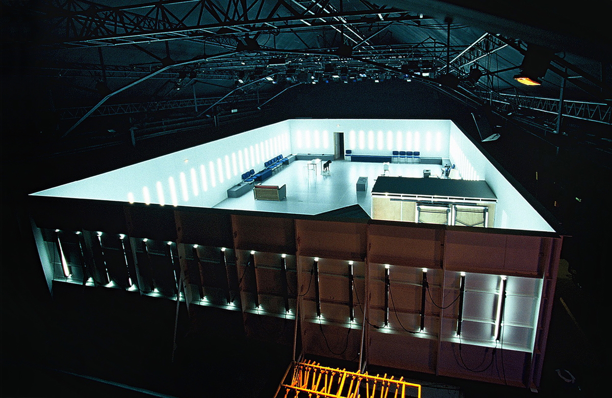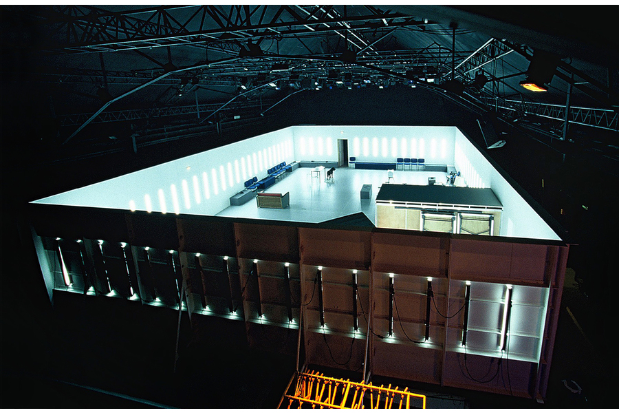 A common space shared by both spectators and actors. The rehearsal setup becomes the performance setup. A peripheral partition brings together all the elements necessary for the show: the control booth, the playing area, the lighting, the props, and the audience.